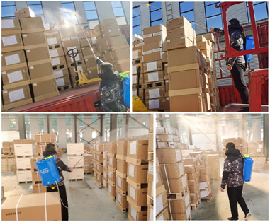 為切實做好物流貨品防疫工作,濟(jì)南工達(dá)結(jié)合現(xiàn)場作業(yè)的實際情況,在做好每日例行場地消毒和防疫防護(hù)措施的基礎(chǔ)上,針對西門子進(jìn)口貨物重點制定了《進(jìn)境物品防疫應(yīng)急預(yù)案》“三重消毒”法,即進(jìn)口集裝箱進(jìn)入監(jiān)管場所后,由專門的消毒人員對車輛和集裝箱進(jìn)行整體的外部消毒;打開集裝箱箱門后,消毒人員先進(jìn)入集裝箱,對箱內(nèi)貨物噴灑消毒液后進(jìn)行二次消毒 ,并保持15-30分鐘后方可進(jìn)行卸貨作業(yè);卸貨完成后,消毒人員對倉庫的貨物進(jìn)行全方位立體環(huán)繞消毒清潔。